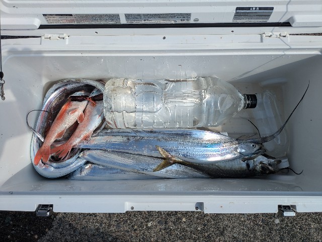 タチウオ1人5匹〜12匹指3〜4本他にエソ、アジ、サバ、小型赤ムツ、真鯛、イシモチが釣れました。