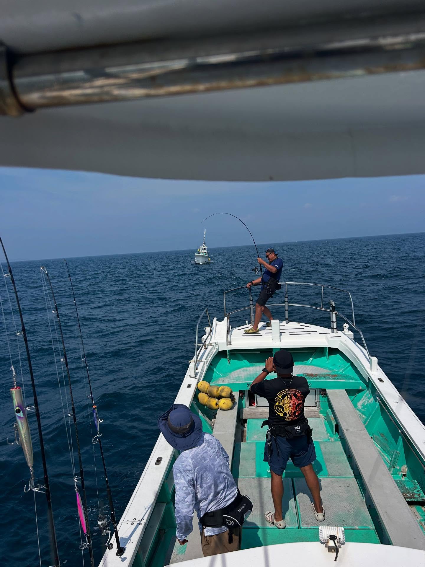はい、今日もキハダキャスティングでした!朝一はナブラ浮かず😓風が入れてくるのを気にしつつしばらく西へ🚢するとナブラが見えてしばらくかまってましたが食わず😓別のナブラを発見!良い感じで、直ぐヒット!😆身体が大きなお客様だったので魚🐟が小さく見えますが45kでした😆まだまだデカイの居ます!6〜8号タックルでお願いします