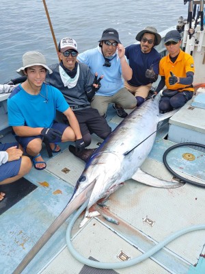 朝からサメ付きイワシ団子が見付かりましたが無反応。その後もカツオ、キハダの群れありましたがノーヒット。帰り際、仲間の船から連絡もらいメカジキ80kgゲットしました。本日は乗船ありがとうございました。