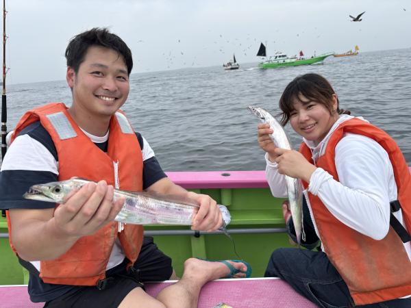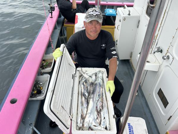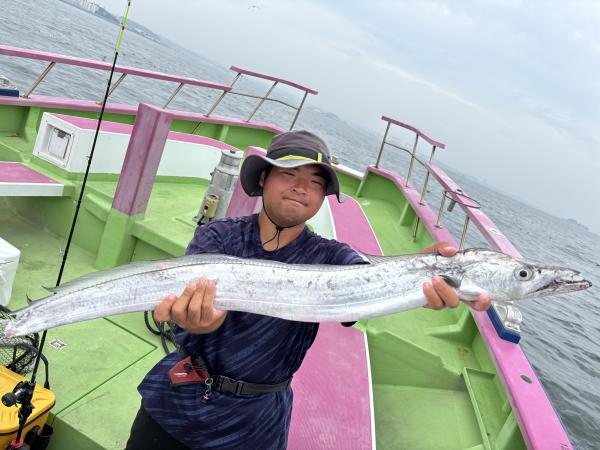 【ショートタチウオ船】 ジャンボ船三隻に別れての出撃でした! 今日も大津沖には広範囲に反応は有りましたが サイズ感は小型が主体で ドラゴン級は混じった程度でした。 それでもアタリは活発で 竿頭40本が2名様・二番手35本・三番手28本でした! お盆休み中のタチウオ船は 常時ジャンボ船三隻体制でお待ちしてます! 貴光船長 【ショートタチウオ2隻目】 本日もタチウオ3隻にて出船できました。 朝一、伊勢町沖からスタートし 開始一投目より テンヤ・天秤共にアタリ良く 連チャンで釣れたりし 中盤より大津沖にて 広範囲に反応があり 時間までアタリ途切れず楽しめました。 最大126センチに トップ天秤で47本・二番手天秤で35本 三番手テンヤで34本でした。 毎日暑いので暑さ対策 飲み物は必ず多めに持ってきてください。 たかし船長 【ショートタチウオ船三隻目】 今日もタチウオ釣りへ!! 小型多めでしたが 当たりは多く!! 天秤は数では優勢でしたが、 小さめ目立ちました。 テンヤは最大125センチに 124センチが2本とか120オーバーも! 竿頭は天秤が46匹!! 二番手テンヤ38匹 三番手もテンヤ33匹 四番手もテンヤ32匹と 皆様お土産はバッチリでした。 頑張って頂きありがとうございました。 祐希船長 【ショートアジ船】 大津沖~観音崎沖でやり 中アジ主体で ポツポツ皆さん見れて楽しめましたね。 竿頭97匹、2番手71匹、3番手65匹の結果で フルレンタルのお客様も 20~37匹とお土産十分キープ出来ました。 また皆さんで遊びに来て下さい。 明日もお付き合い、ご予約お待ちしてます。 勝司船長