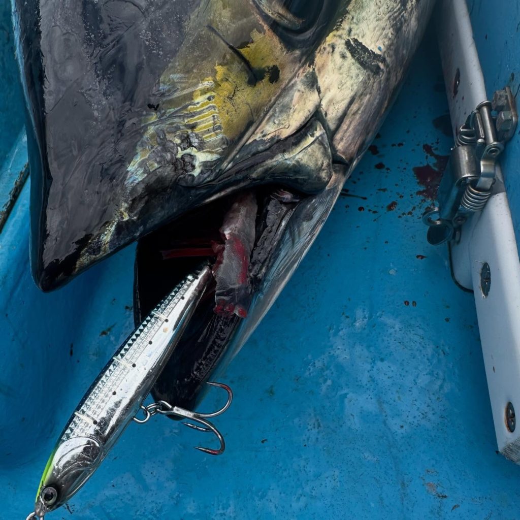 今日はキハダ乗合!昨日の時化後で期待して出船❗️朝のうちはイルカの大群でやばい雰囲気でしたが、じきにハミが出て小ぶりのをゲット‼️