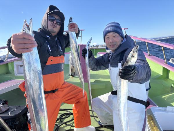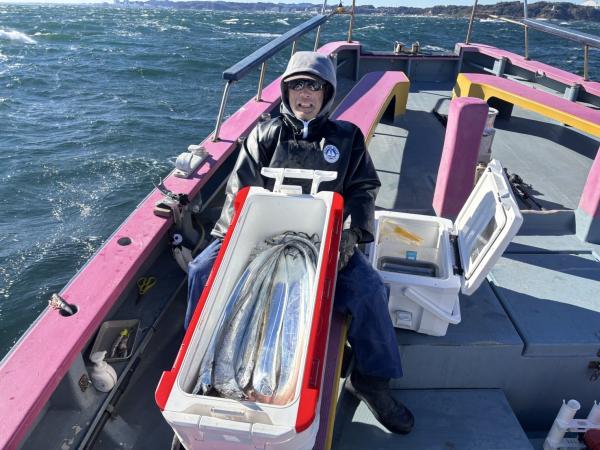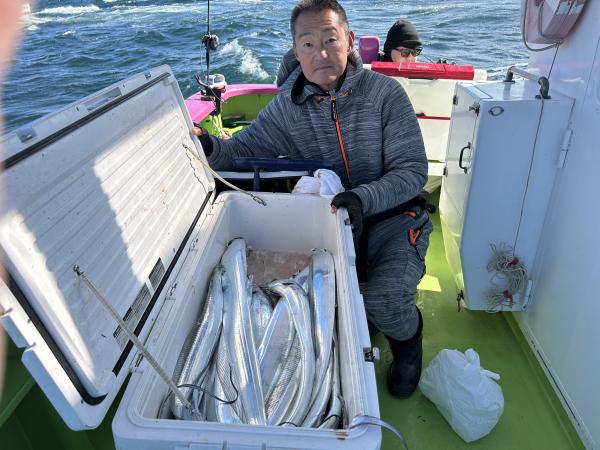 【ショートタチウオ船】 本日はジャンボ船三隻での出撃でした! 観音崎沖には広範囲に反応有りまして 終日アタリは活発でした! 昼頃に南西の強風で 正午に納竿となりましたが皆さんクーラー賑わいました! 竿頭24本 二番手22本 三番手20本が2名様でした! 明日は南西の強風予報の為に全船中止とさせて頂きます。 貴光船長 【ショートタチウオ2隻目】 本日は、タチウオ3隻にて出船できました。 観音崎沖からスタートし 開始一投目より型が見れ 間が開きながら釣れ 反応には困らない感じで 移動も少なく楽しめました。 段々と南西の風が強くなり 12時早上がりになりました。 トップは、タチウオ釣り初挑戦の方が16本 二番手テンヤで15本でした。 明日は、残念ながら南西の風が爆風予報の為出船中止で 月曜日は凪予報なので皆様お待ちしております! たかし船長 【ショートタチウオ船3隻目】 今日もタチウオ釣りへ!! バリバリないんですけど、 一日ポツン、ポツンと 追加出来ました。 平均サイズバッチリで楽しめました。 竿頭テンヤ20匹が2名様 二番手天秤18匹 三番手天秤15匹の結果でした。 頑張って頂きありがとうございました。 祐希船長 【ショートアジ船】 久里浜沖でやり 前半はどこをやってもダメで 中盤から良い所にあたり 中アジ主体で皆さんポツポツと見れて楽しめました。 南西の強風になり 海も悪く11時半に沖上がりしました。 竿頭32匹、2番手31匹、3番手25匹が3名様の結果でした。 厳しいアジ釣りでしたが 最後まで皆さん頑張って頂きありがとう御座いました。 また皆さんで遊びに来て下さい。 勝司船長