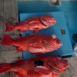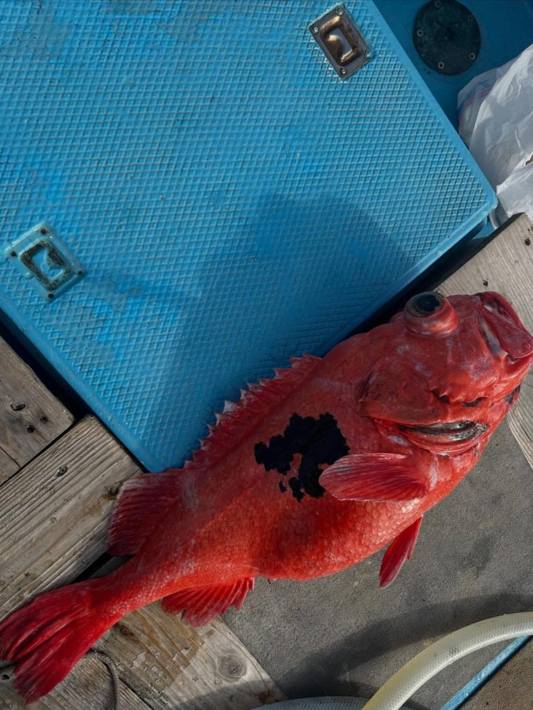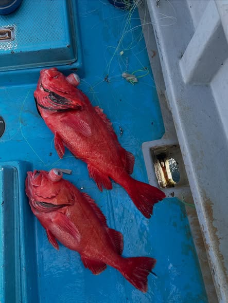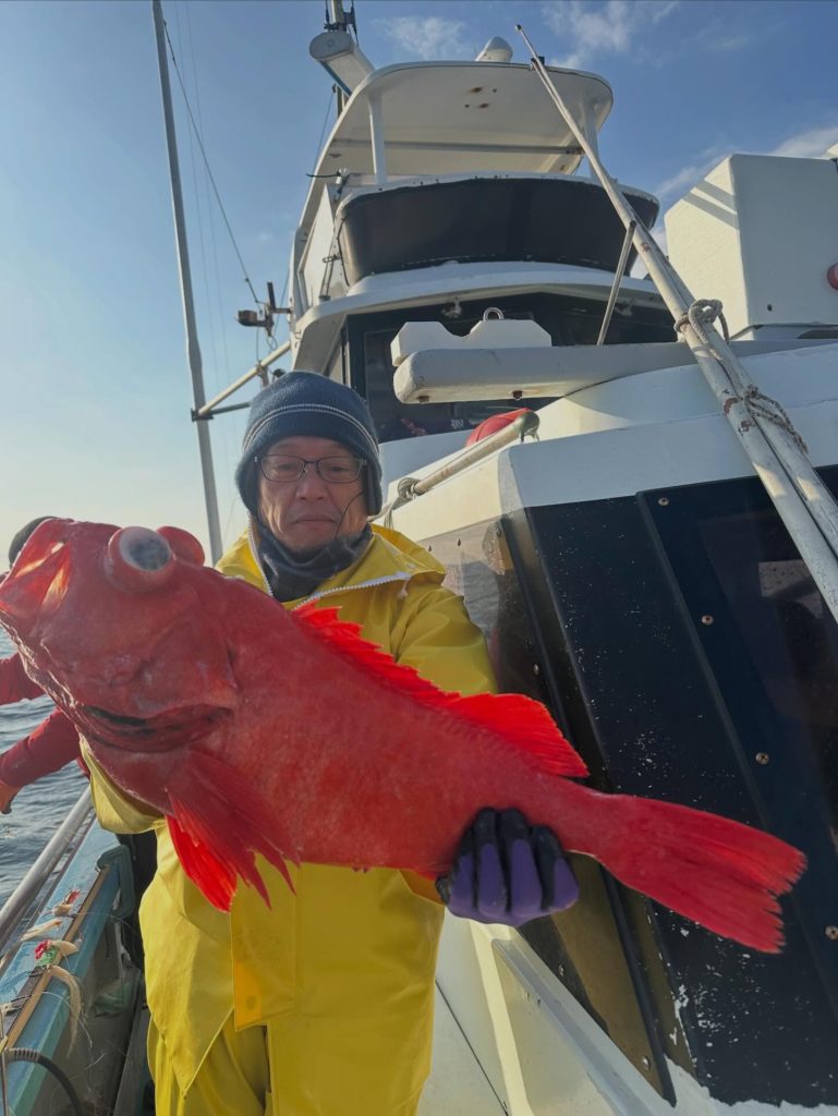 今日は超深海紅アコウ❗️朝イチにいい当たり❗️いましたー😊良型浮上ーー🔥幸先良いスタート!と思いきや2投3投当たりなし💦場所移動した4投目‼️全員に激しい当たり🤩期待の巻き上げ重量感MAX‼️先ずは1本浮上ーー🔥そして2人目も浮上ーー🔥まだいるよー!からのトリプル浮上ーー🔥🔥🔥最後の1人も浮上ーー浮上ーー🔥🔥のダブルゲット‼️最後の流しもいい当たりからの途中でオッパズレ💦外れるって事は紅だってねー😅と話しながら片付けてたら、ボッカーン‼️浮上ーーしました😍結局船中8本ゲット👍しかも貸し竿の初挑戦の方が5本‼️やり過ぎです😅
