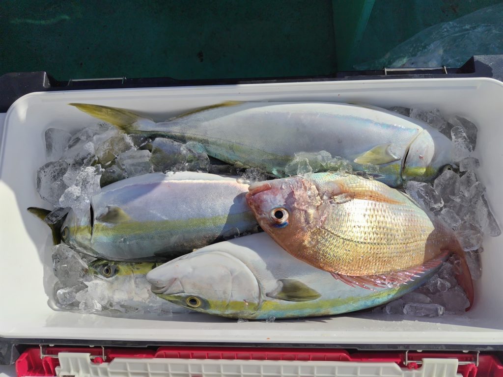 イナダの食い良くポツポツ釣れ、マダイ、チカメキントキ、サバ、ソ-ダ等混じりク-ラ-満タンで早上がりで楽しめました。
